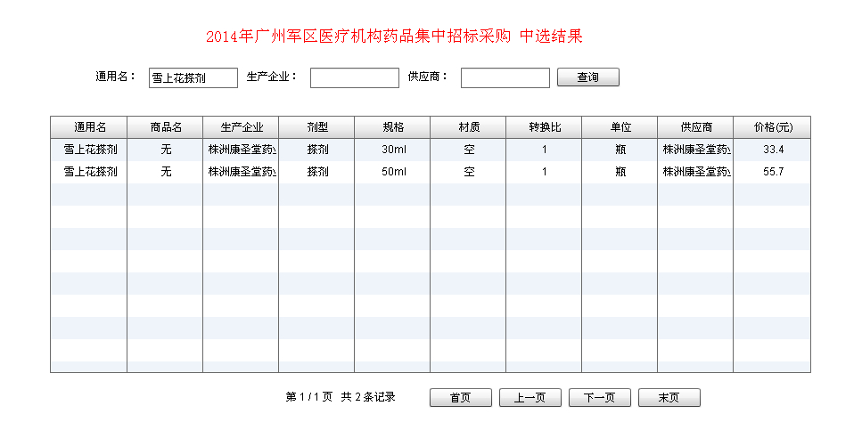 2014年广州军区医疗机构药品集中采购成交候选品种的异议经广州军区医疗机构药材集中招标采购领导小组办公室处理完毕,2014年10月28日-2014年10月30日17:00将中选结果挂网公告,我公司产品“雪上花搽剂”中选,其中30毫升中标价为33.4元/盒,50毫升中标价为55.7元/盒。